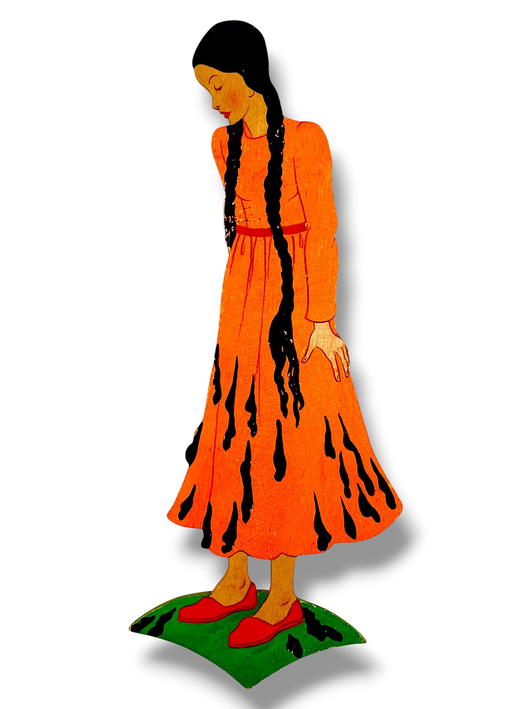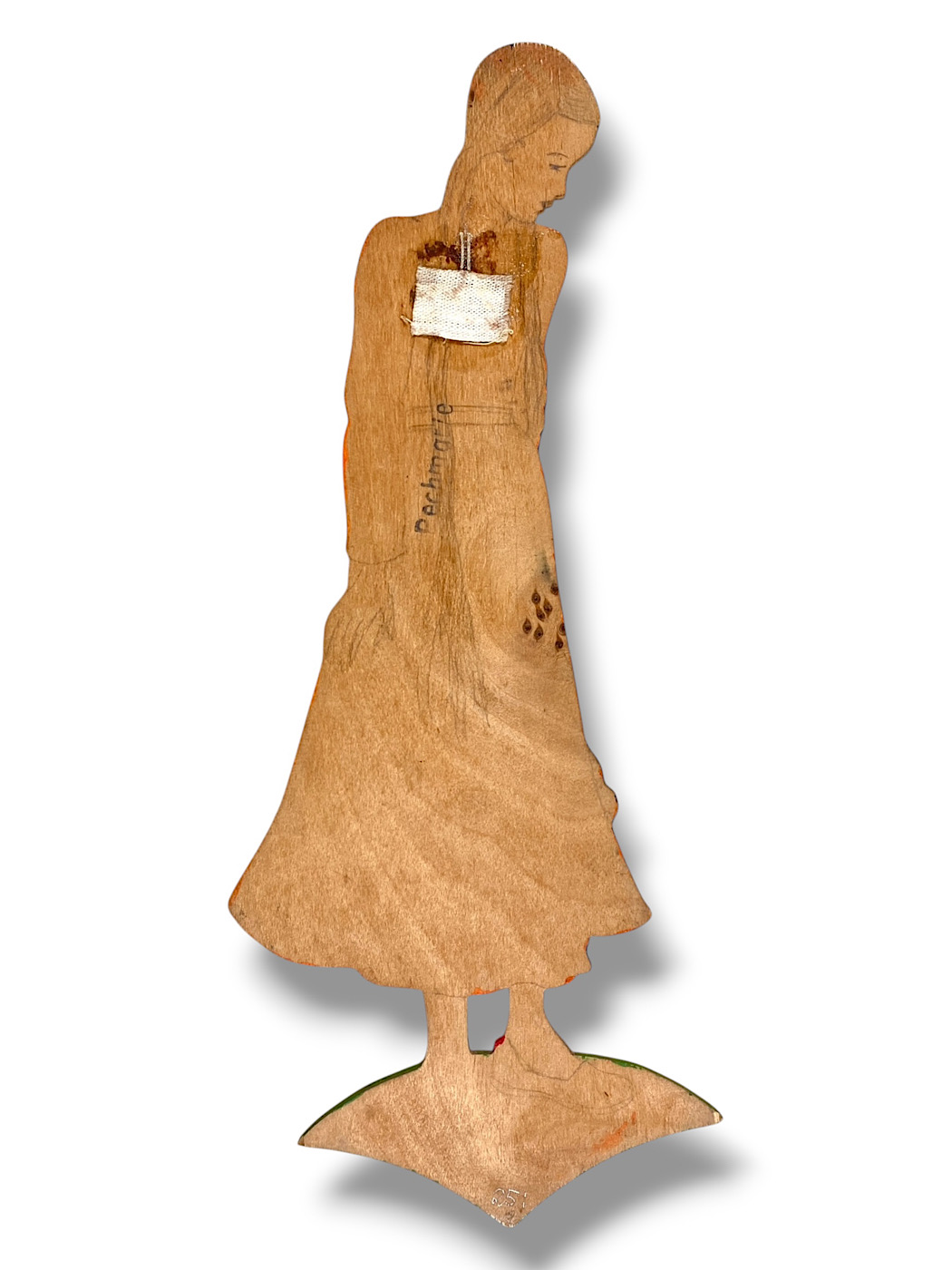 1930er Mertens-Kunst: Frühe orange Pechmarie mit rotem Gürtel, Handbemalt 24cm 🇬🇧 Antique Pitch Mary with Red Belt (Märchen-Holzbild, German Wall Figure) *