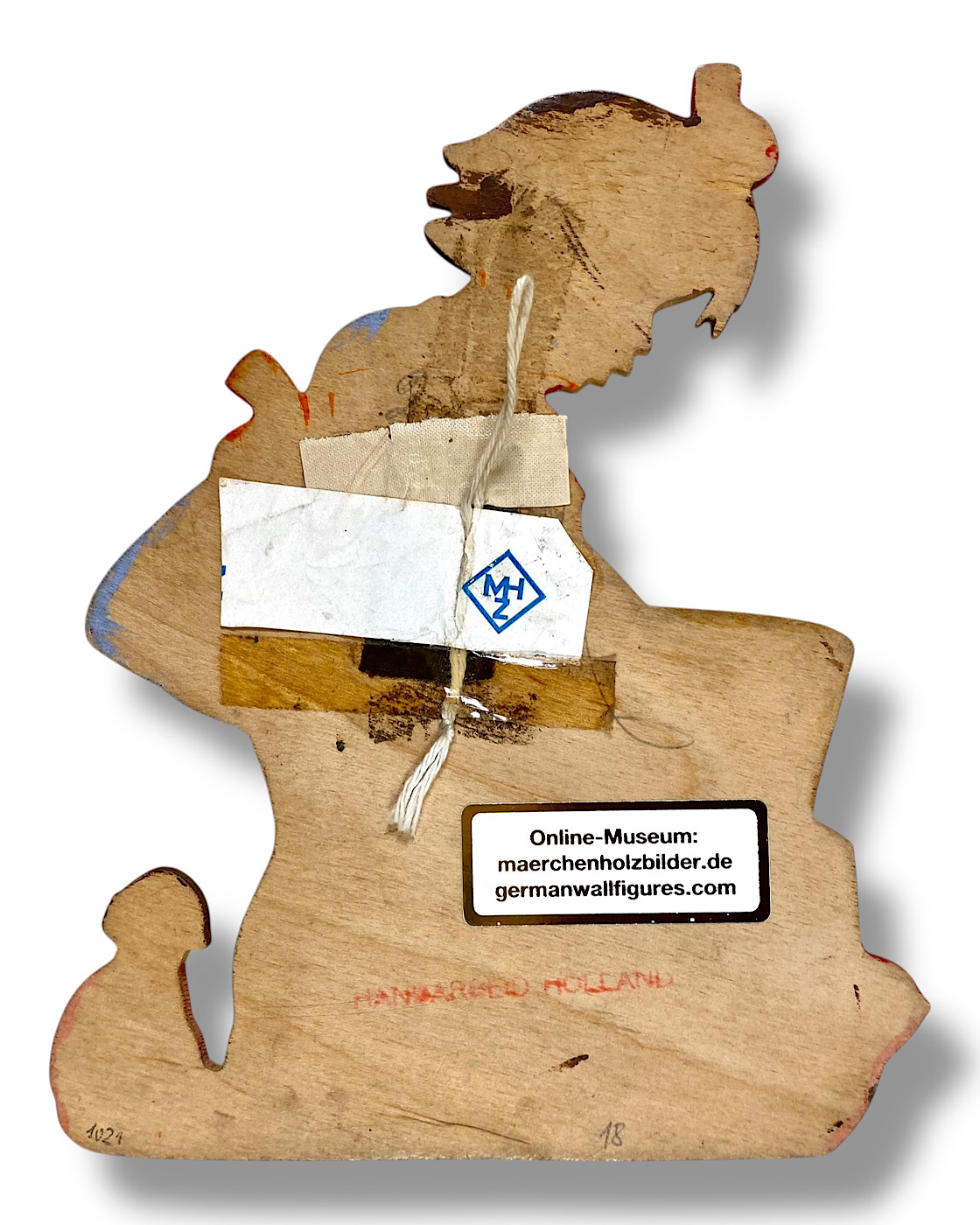 HOLLAND, TIPPFEHLER: Es gibt schöne, sich sehr ähnelnde Wandfiguren aus den Niederlanden, vermutlich aus den 1930er und 1940er Jahren. Manchmal steht „Handarbeid Holland“ (häufig in rot) oder „Handbemahlt“ auf der Rückseite. „Handarbeid“-Beispiele: Pelikan-Reiter, Zaun-Kinder, Waschzuber-Mädchen und ein Angler-Zwerg, an dem man die Technik der Motivaufbringung erkennt, denn auf der Rückseite ist das gleiche Motiv aufgedruckt, nur unbemalt. „Handbemahlt“-Beispiele: ein Junge mit einem Fußball, ein Junge mit einer Kerze und ein Mädchen mit einer riesigen Tasche. Manchmal findet man nur (oder zusätzlich) die Zahl 1, 2, 3 oder 4 und teilweise einen dreieckigen Papieraufhänger. Es könnte sein, dass es sich immer um den gleichen Hersteller handelt. Vermutlich von einem anderen Produzenten stammen die Niederlande-Figuren mit den dicken braunen gedruckten Umrissen, zum Beispiel ein erschöpfter Fliegenpilz-Zwerg. Weiß jemand mehr darüber? Bitte schreiben Sie mir! (Aus dem Buch: Die Ära der Märchen-Holzbilder, Vintage German Wall Figures, 2025, Christiane Dietz)