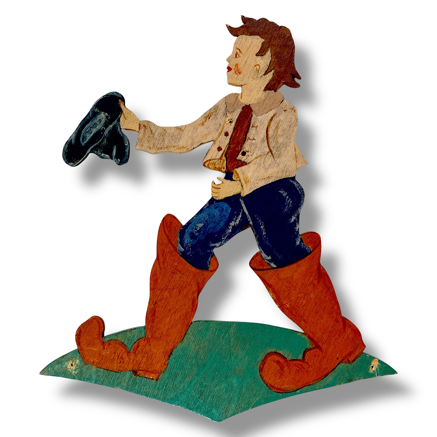[EN] LITTLE THUMB: Because Little Thumb (Tom Thumb) by Charles Perrault is a rather gruesome fairy tale, it was read less and less as a bedtime story over the course of the last century. However, one scene continued to appear on German Wall Figures until the 1980s: the moment when Little Thumb travels in the ogre’s (man-eater’s) seven-league boots. The title was changed: The figures were no longer called “Little Thumb” but “Seven-League Boots.” Only Ravi consistently kept the name “Little Thumb.” Heller’s Christmas tree ornament from the 1930s still explicitly bore the name “Little Thumb,” but the cheerful 1960s version (with the gray cape) was labeled “Seven-League Boots” on the back. So, whenever you see a small boy in seven-league boots on an old wood plaque, it is actually Little Thumb from the fairy tale collection by Charles Perrault. (From the Book: Vintage German Wall Figures, Die Ära der Märchen-Holzbilder, 2025, Christiane Dietz)