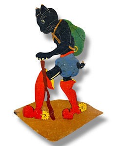 IRMSCHER FIGUREN: Von diesem Hersteller aus der ehemaligen DDR kenne ich etwa ein Dutzend Motive; die meisten sind klassische Märchenfiguren. Auf der Rückseite findet man oft folgenden Stempel: „Irmscher Figuren, Karl-Marx-Stadt“. Karl-Marx-Stadt heißt heute wieder Chemnitz. Die Irmscher Figuren sind etwas kleiner und aus etwas dickerem Holz als üblich. Die Farben haben oft einen leichten Gelbstich, es wurden dicke, satte Farben verwendet, und ein ebenso dicker und satter Firnis (Schutzschicht). Schöne und originelle Arbeiten von Irmscher Figuren, die ich von keiner anderen Manufaktur kenne: ein Schneewittchen mit Suppenterrine, ein gähnendes Dornröschen mit den vielen reizenden Details und eine grüne Froschkönig-Prinzessin mit einem großen doppelten Rüschenkragen. (Aus dem Buch: Die Ära der Märchen-Holzbilder, Vintage German Wall Figures, 2025, Christiane Dietz)