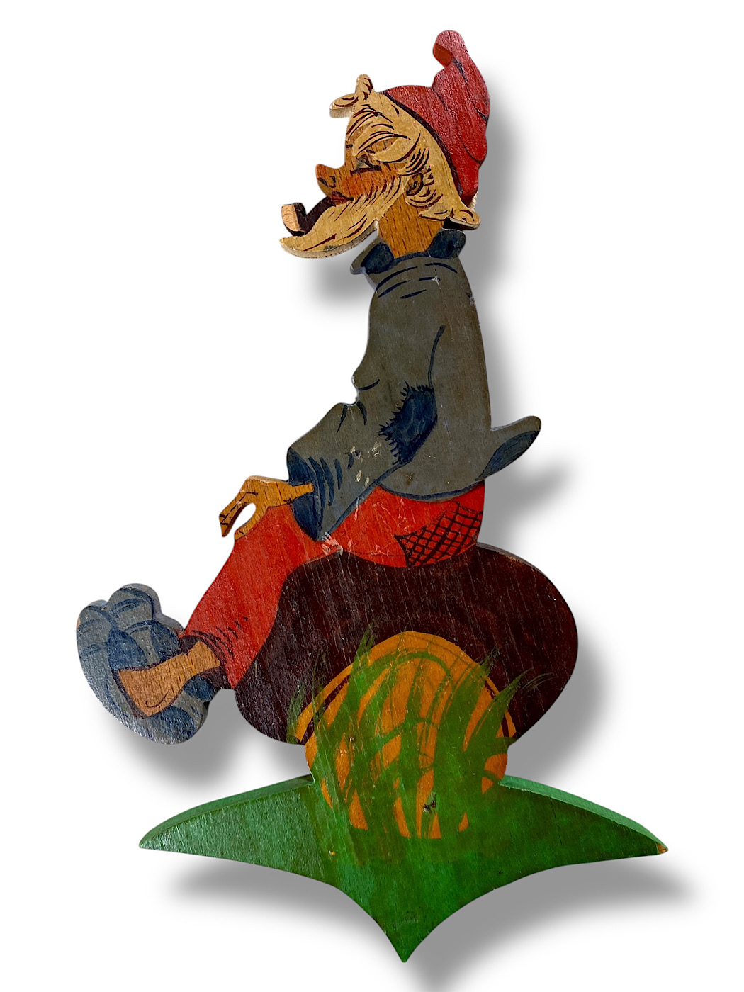 1930er Märchen-Holzbild: Pfeifenzwerg auf Steinpilz, Holstenkunst