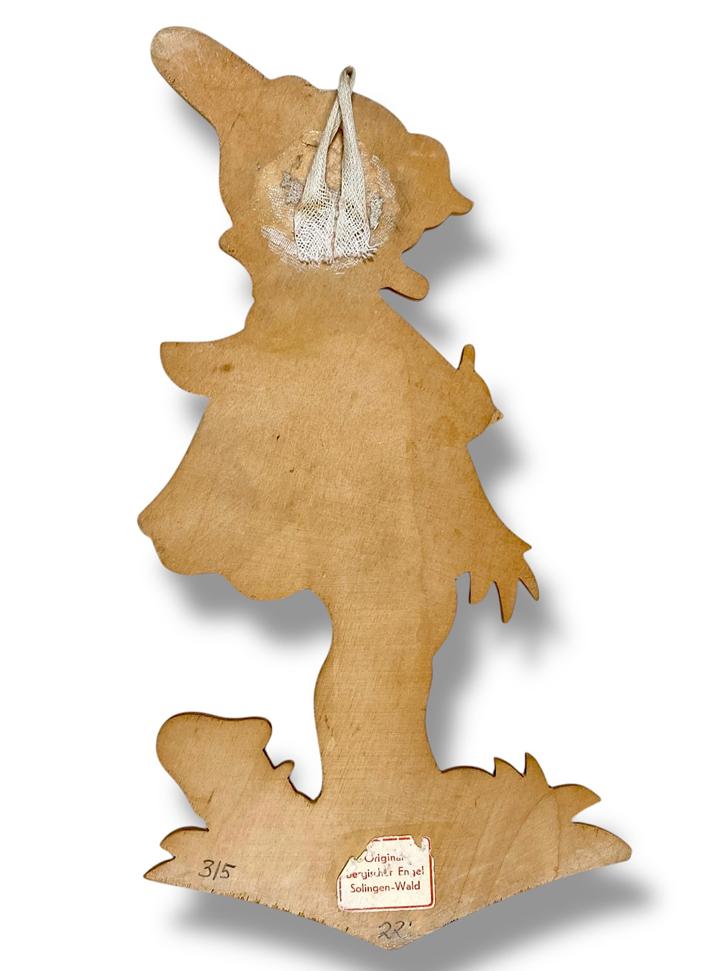 [EN] “I NEVER DREW THOSE BIG HEADS!” In the 1960s many German Wall Figures got large heads and big eyes, following the so-called baby schema (Kindchenschema). This becomes interesting with the figures that Alfred Mertens produced after he had bought the Original Bergischer Engel from the former owner Johanna Gruner-Witkop in 1967. She also allowed Mertens-Kunst to stamp the names “Original Bergischer Engel” as well as “Gruner Witkop” on the backs of their wall figures. In the new millennium, she could show me exactly which Original Bergischer Engel and Gruner Witkop figures were actually produced by Mertens, even though “her” name was on them. “I never drew those big heads!” she said! (From the Book: Vintage German Wall Figures, Die Ära der Märchen-Holzbilder, 2025, Christiane Dietz)