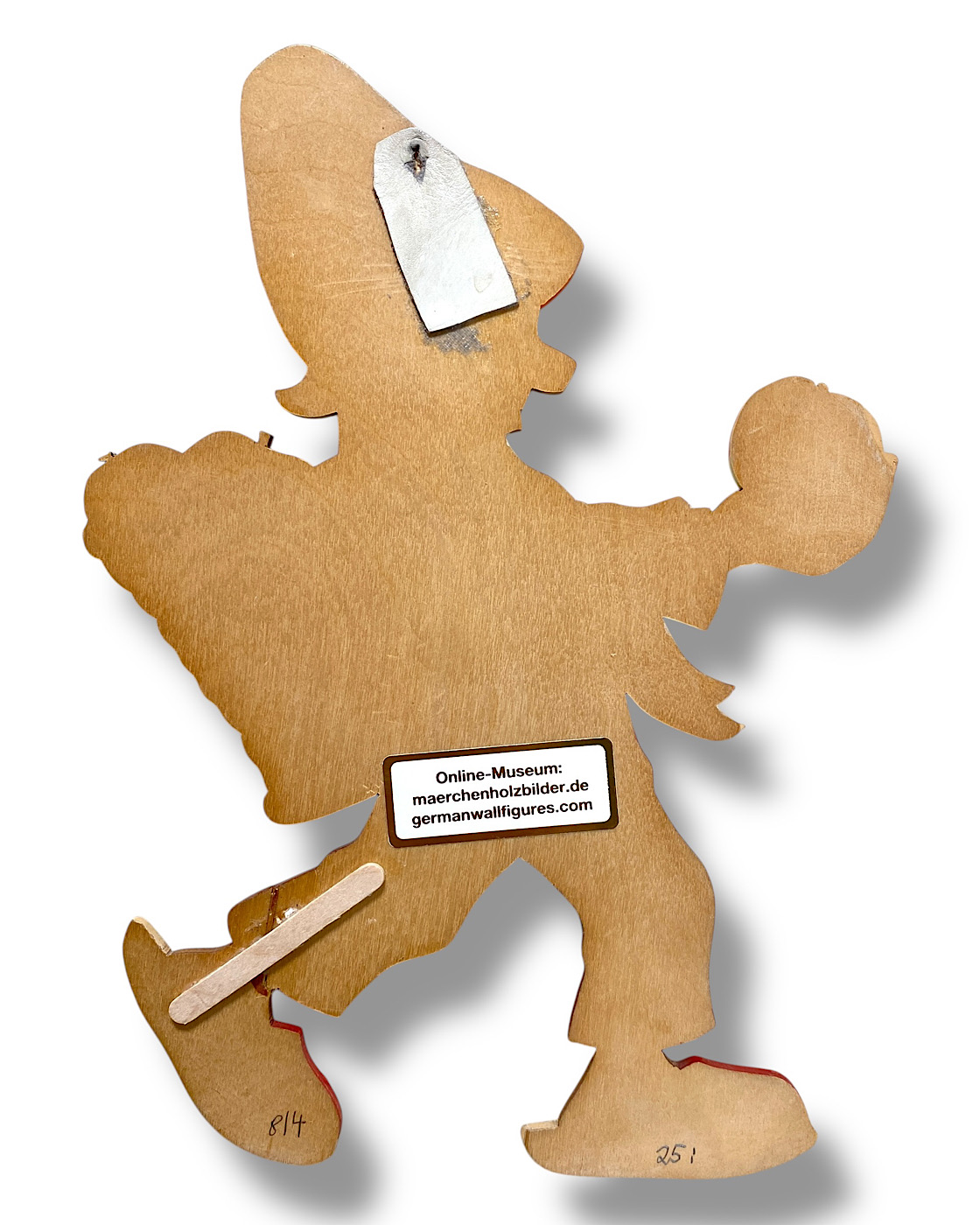 [EN] HELLER, ERAS: You can divide the Hellerkunst wood pictures into three eras: antique, mid-century, and vintage. The antique figures are from the 1920s and 1930s, with the very early ones often having a base with straight sides and sharp edges. The mid-century Heller wall figures had rounded bases and were completely hand-painted until about 1960, after which came a transitional period with screen printing plus additional hand-painting. The vintage Hellerkunst figures from the late 20th century were screen-printed only, with no more hand-painting. (From the book: Vintage German Wall Figures, Die Ära der Märchen-Holzbilder, 2025, Christiane Dietz)