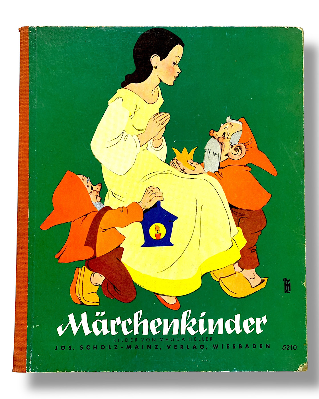 HELLER, BÜCHER: Magda Heller von Hellerkunst hat um die letzte Jahrhundertmitte herum auch Bücher und Postkarten illustriert. Einige davon erschienen als Leporello-Bücher, also als gefaltete Bücher, auch als Ziehharmonika-Bücher bekannt. Eines davon hatte speziell entworfene Märchenfiguren, die von Heller dann auch als Kunststoff-Figuren hergestellt wurden. Auf dem Cover steht Folgendes: „Märchenkinder, Bilder von Magda Heller, Jos. Scholz-Mainz, Verlag, Wiesbaden.“ (Aus dem Buch: Die Ära der Märchen-Holzbilder, Vintage German Wall Figures, 2025, Christiane Dietz)