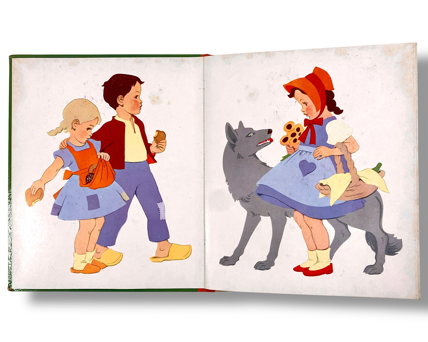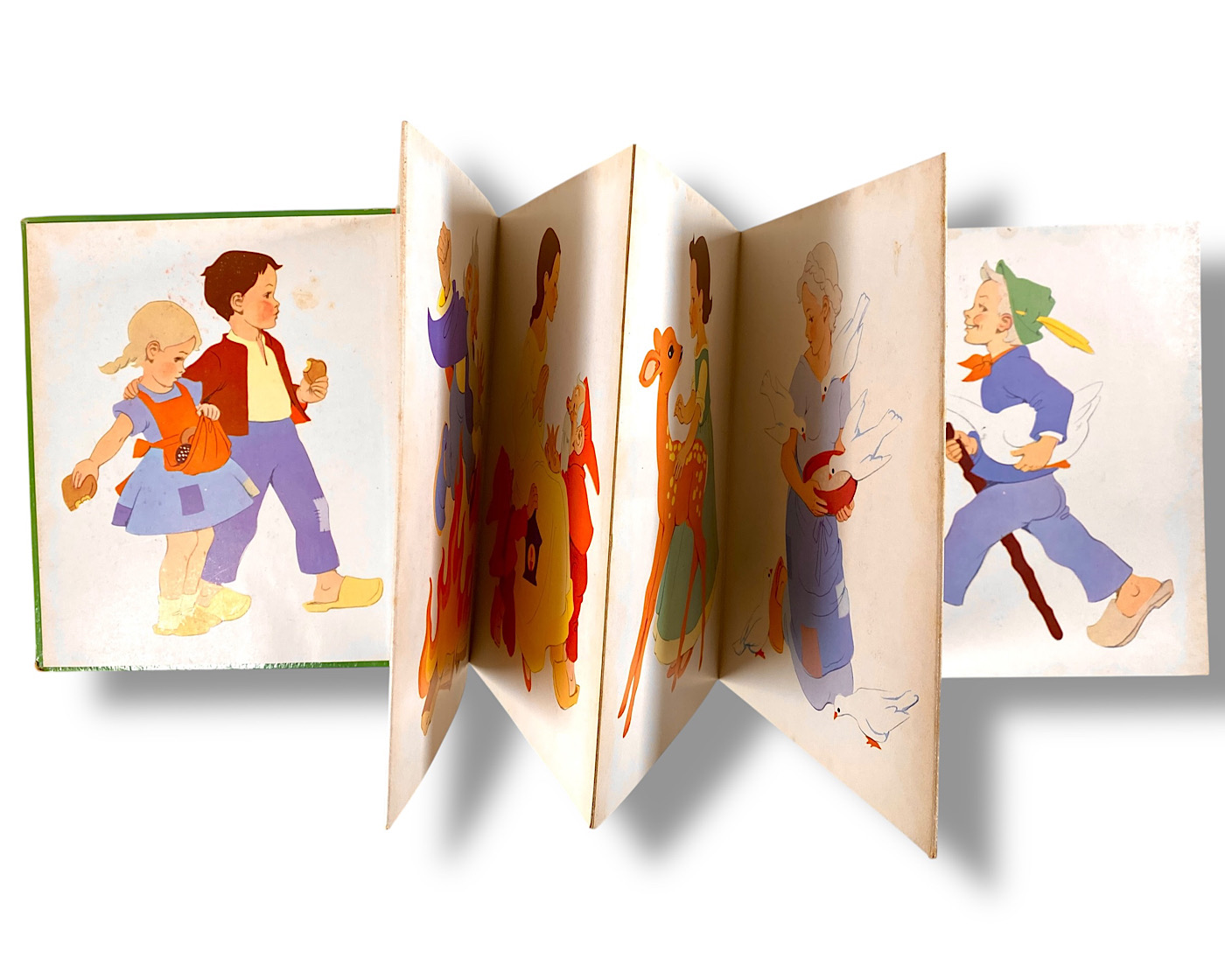 1960er Märchen-Holzbilder: Leporello-Kinderbuch „Märchenkinder“, Magda Heller, Josef Scholz Verlag, Mainz, Abbildungen von acht Märchen-Plastikbildern, Hänsel und Gretel, Rotkäppchen, Rumpelstilzchen, Schneewittchen, Brüderchen und Schwesterchen, Aschenputtel, Froschkönig, Hans im Glück [EN] Midcentury German Wall Figures: Children’s Book, Accordion Book, “Fairy Tale Children”, Magda Heller, Josef Schulz Verlag, Mainz, Pictures of acht Plastic Wall Figures, Hansel and Gretel, Little Red Riding Hood, Rumpelstiltskin, Snow White, Little Brother and Little Sister, Cinderella, Frog Prince, Hans in Luck