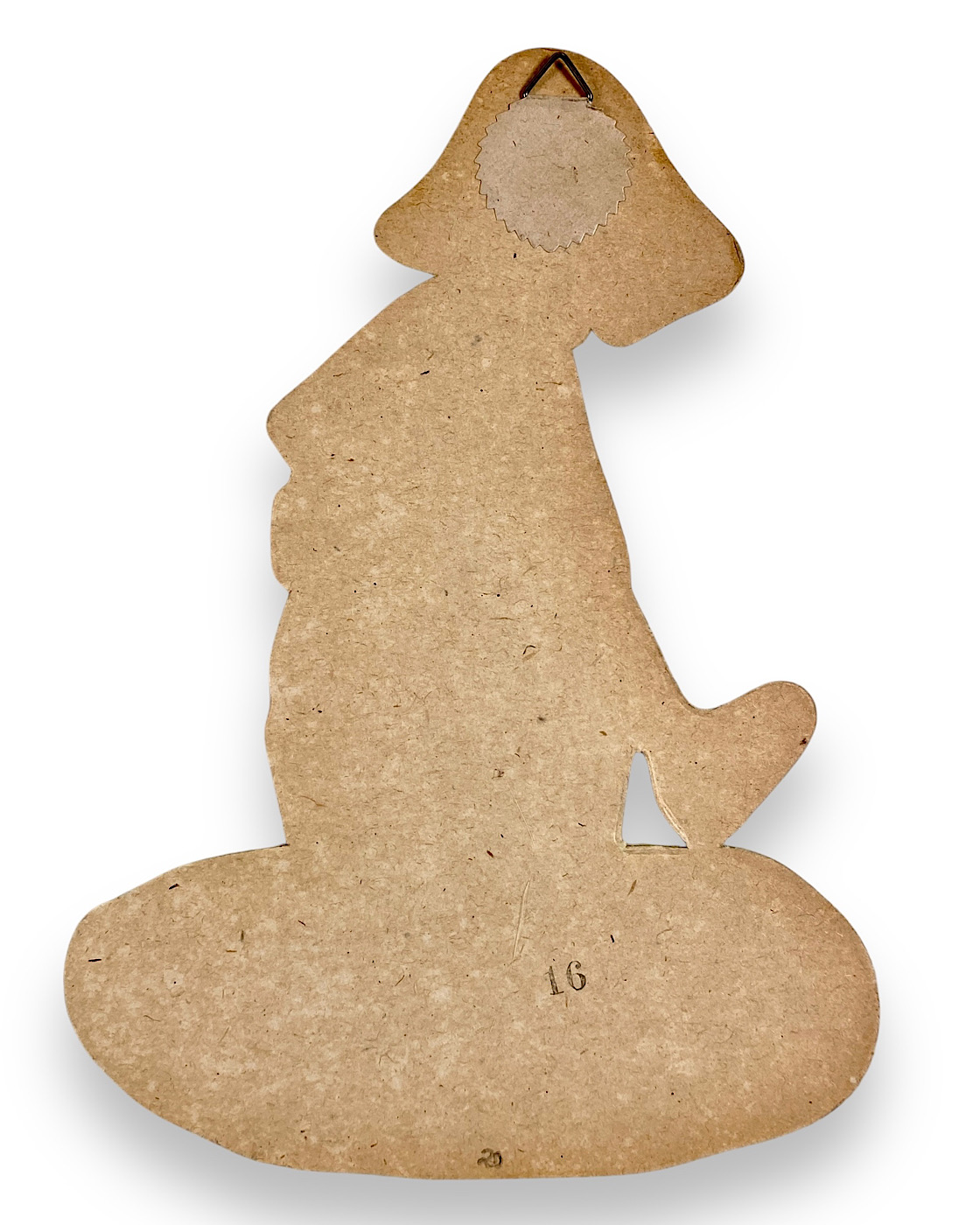 PAPPE-FIGUREN: In den Kriegsjahren (Zweiten Weltkrieg) stiegen einige Hersteller von Märchen-Holzbildern auf Pappe um, wegen des Materialmangels. Auf eigenen dieser Kriegsware-Figuren steht auf der Rückseite ein Hinweis-Stempel, dass die Produktion „vorübergehend auf Pappe“ erfolgt. Das ist zum Beispiel bei einer handbemalten Aschenputtel-Figur der Fall, die leider einen schlecht lesbaren Hersteller-Stempel hat: Es scheint das Wort „Kunsttruhe“ zum Namen zu gehören und es ist auch eine Truhe abgebildet. Neben den Kriegspappe-Bildern gab es auch Manufakturen, die ohne Not Pappe-Figuren herstellten, viele davon wurden sogar handbemalt. Sie sind aber eher die Ausnahme in der Märchen-Holzbild-Ära (1920er bis 1980er). (Aus dem Buch: Die Ära der Märchen-Holzbilder, Vintage German Wall Figures, 2025, Christiane Dietz)