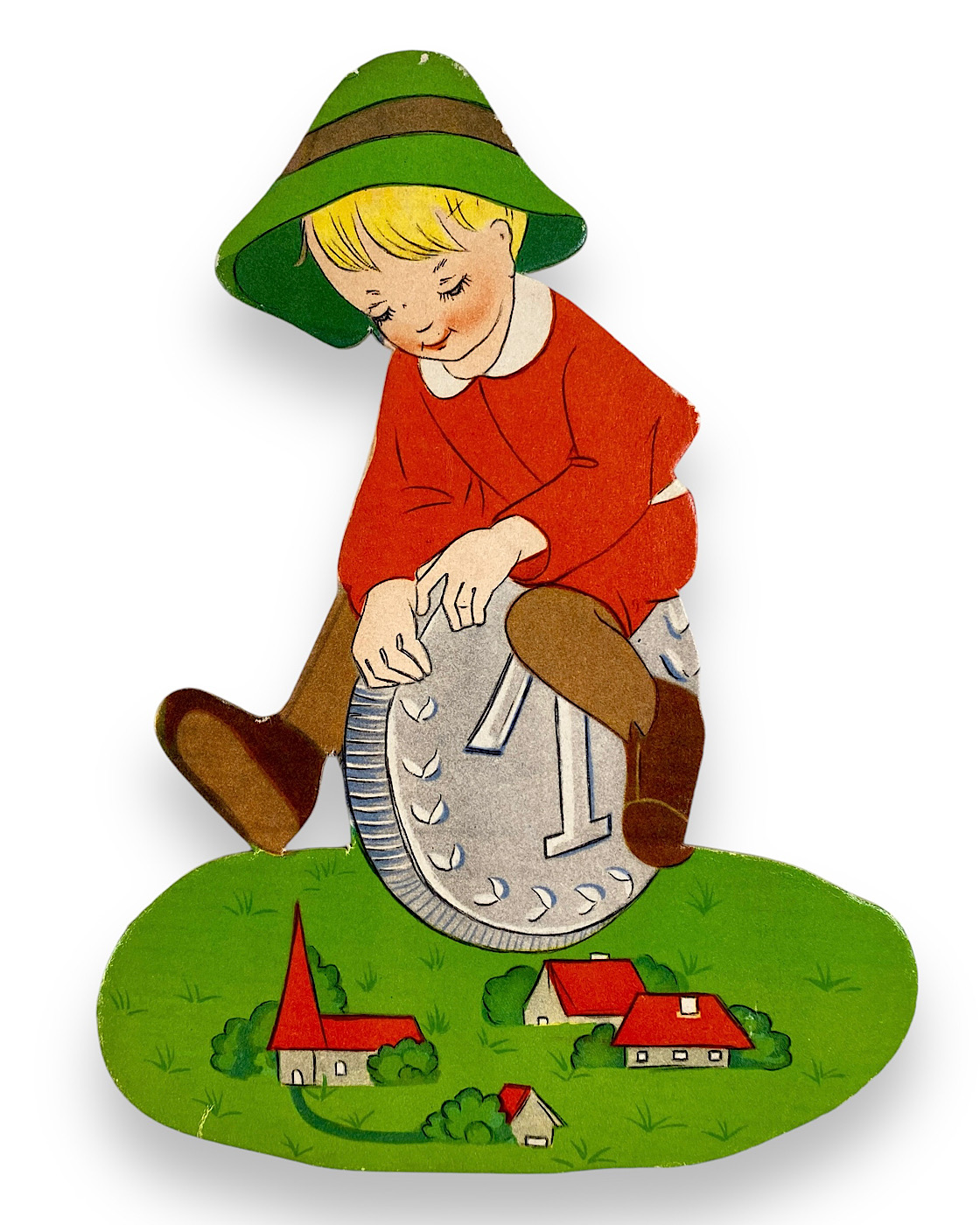 1950er Pappe-Figur: Kleiner Junge auf Münze reitend 20cm [EN] Cardboard Figure: Little Boy Riding on Coin