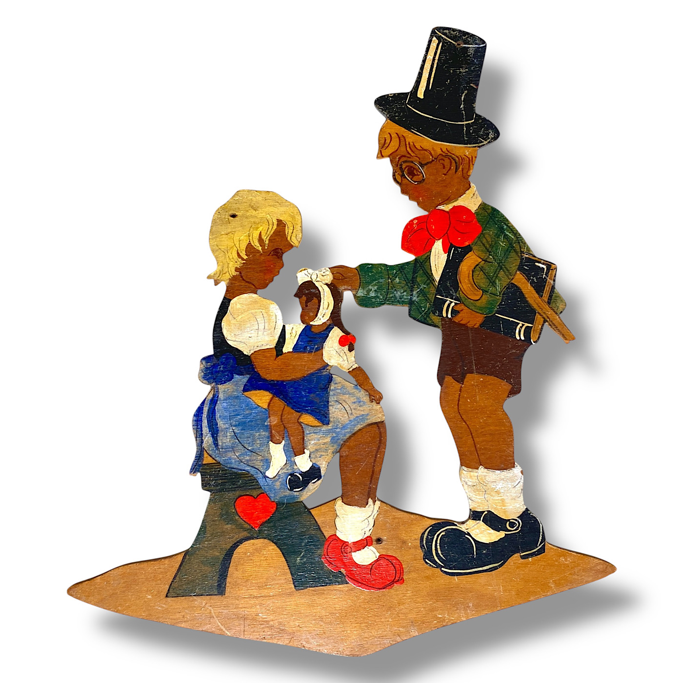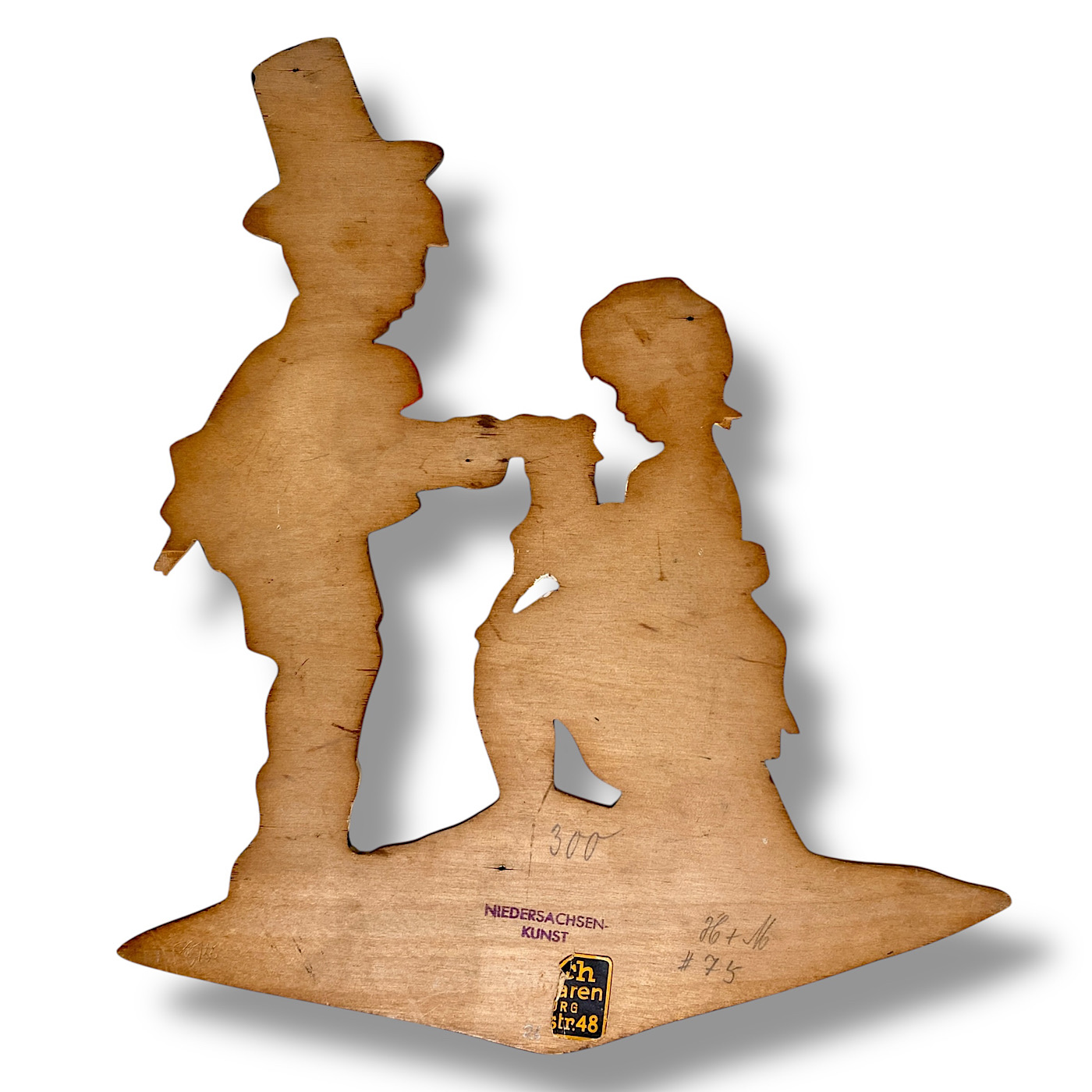 1930er Niedersachsen-Kunst: Puppendoktor-Kinder mit Zylinderhut, Handbemalt, 26 cm, Märchen-Holzbild 🇬🇧 1930s Niedersachsen-Kunst: Toy Doctor Children with Top Hat, Hand-painted, 26 cm, German Wall Figure